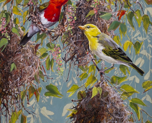 Oil on Canvas. Red Headed Weavers. 53cm x 70cm. Available in print.