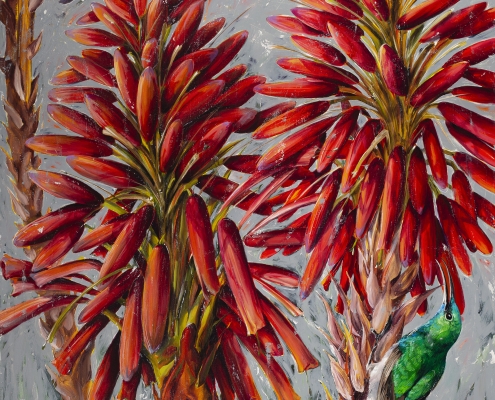 Oil on Canvas. Aloe & White Bellied Sunbird. 150cm x 90cm. Available in print and wallpaper.